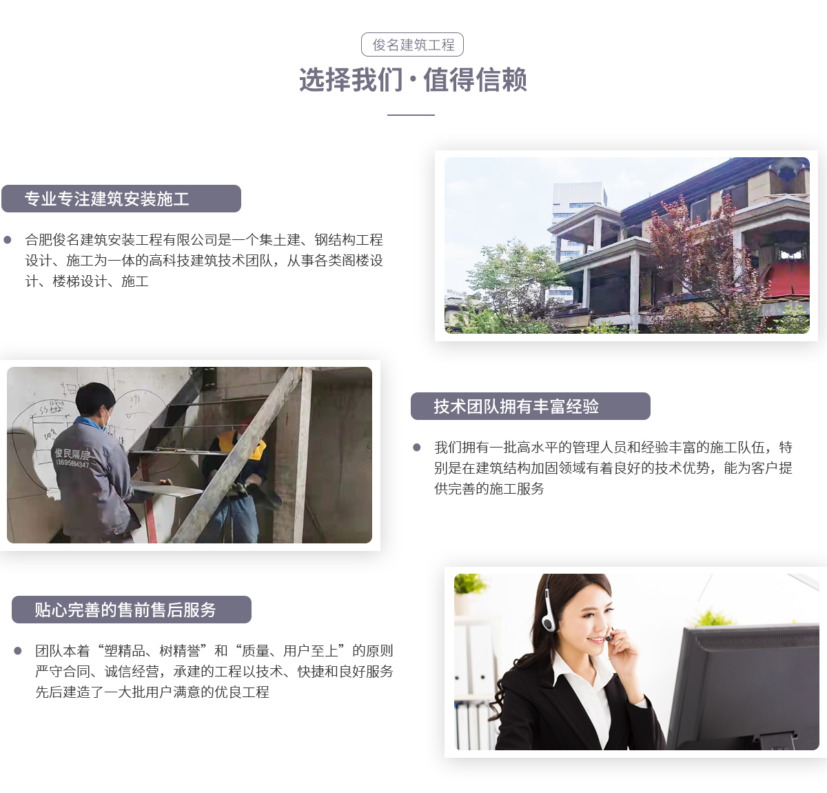 - 合肥俊名建筑安裝工程有限公司是一個集土建、鋼結(jié)構(gòu)工程設(shè)計(jì)、施工為一體的高科技建筑技術(shù)團(tuán)隊(duì),從事各類閣樓設(shè)計(jì)、施工。我們擁有一批高水平的管理人員和經(jīng)驗(yàn)豐富的施工隊(duì)伍,特別是在建筑結(jié)構(gòu)加固領(lǐng)域有著良好的技術(shù)優(yōu)勢。團(tuán)隊(duì)員工精誠團(tuán)結(jié),以“尊重規(guī)范,拒絕平凡”為宗旨,為客戶提供完善的施工服務(wù)。團(tuán)隊(duì)本著“塑精品、樹精譽(yù)”和“質(zhì)量、用戶至上”的原則,嚴(yán)守合同、誠信經(jīng)營,所...